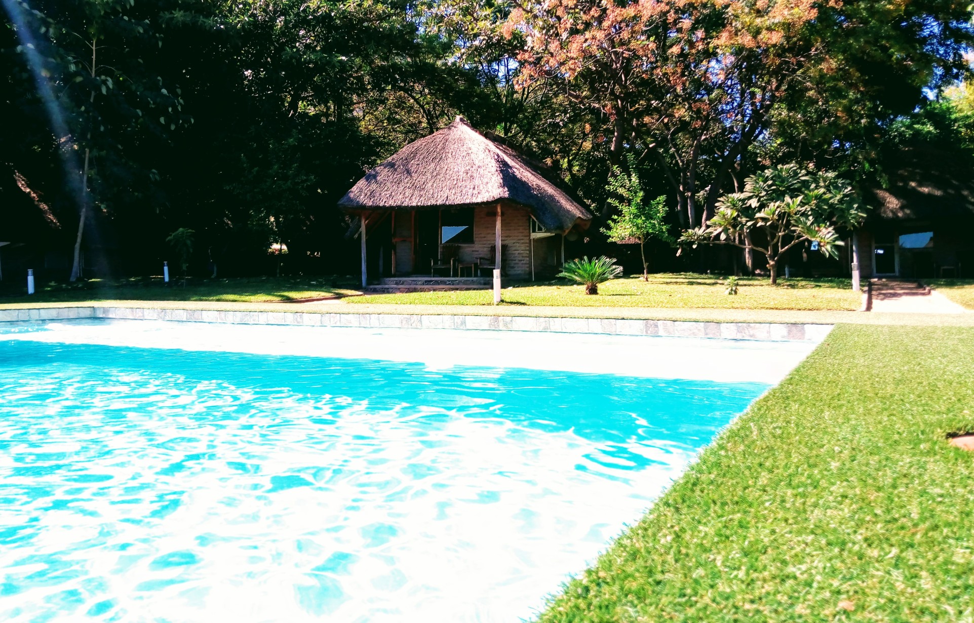 Firstly, a good-sized swimming pool. The pool sits at the view of the rooms and the beach where people sit and chat or read, and then it gently gets deeper. There are plenty of sun-loungers. And there is covered seating if you want a break from the sun. You will love this area for morning writing with a coffee in the shade – very handy!